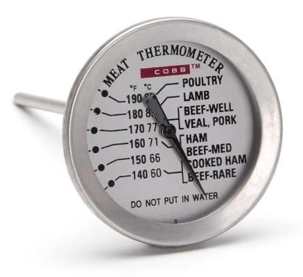 Het koken met de Cobb wordt beïnvloed door de weersomstandigheden en de kwaliteit van de briketten. Dat valt niet te beïnvloeden en om die reden is de kerntemperatuur een prima graadmeter.