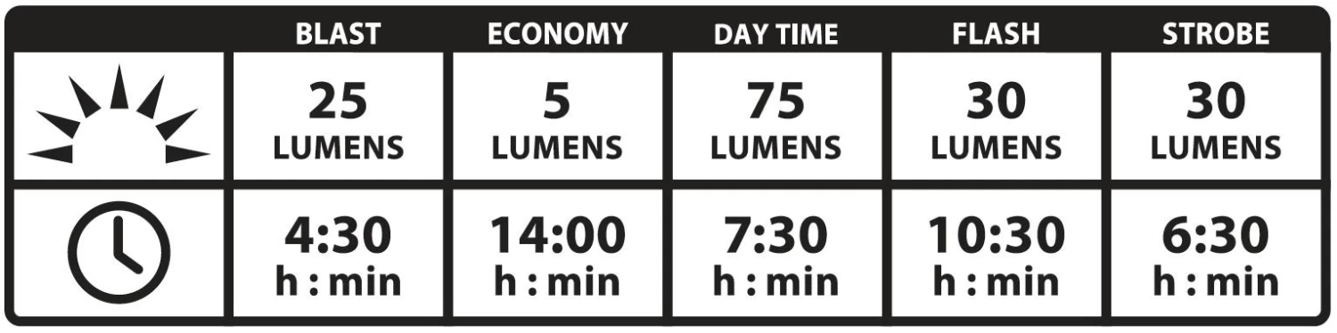 - Maximaal 14 uur op de FLASH 2 Stand (10 Lumen)